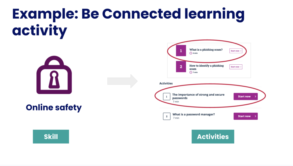 For example: the Be Connected online course ‘What is a phishing scam‘ would be one activity. This would be recorded under the skill ‘Online safety’ in my.GoodThings.